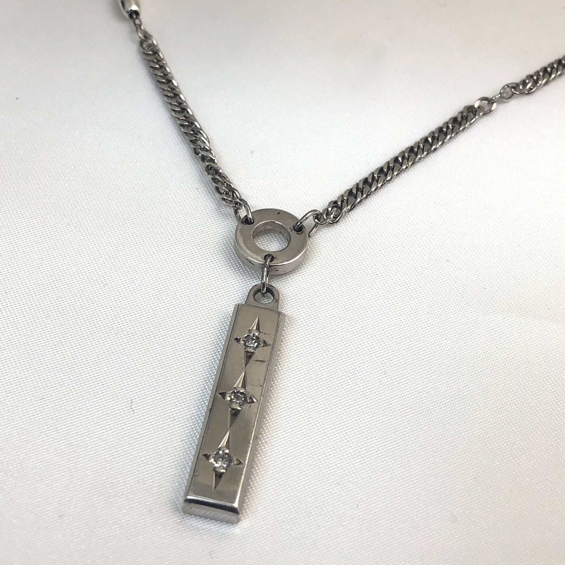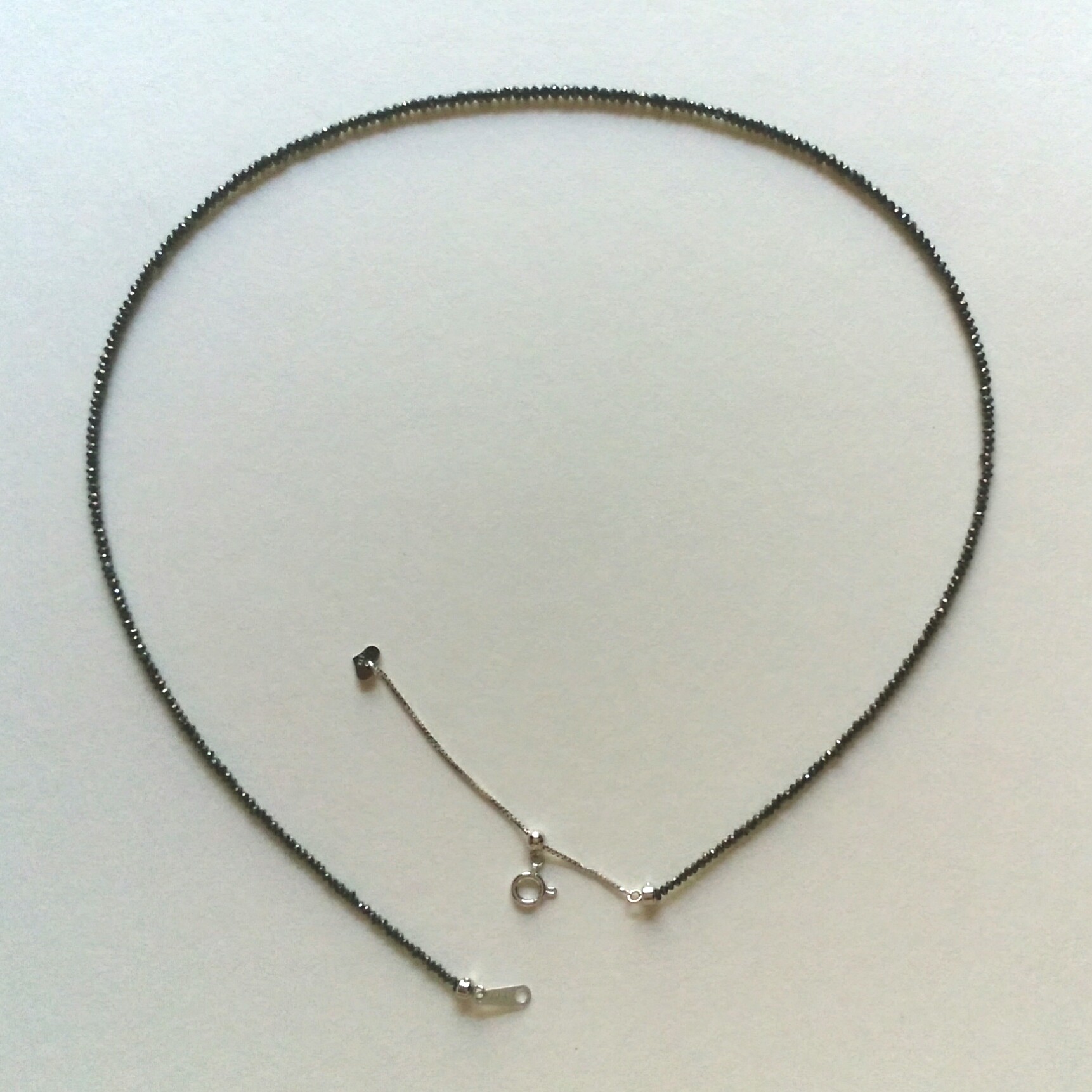 埼玉県熊谷市の方よりブラックダイヤモンドのネックレスを短くしたいという長さ調整のご依頼をいただきました。スライド部分を取り外し、左右3㎝づつほど短くして、留めなおしました。